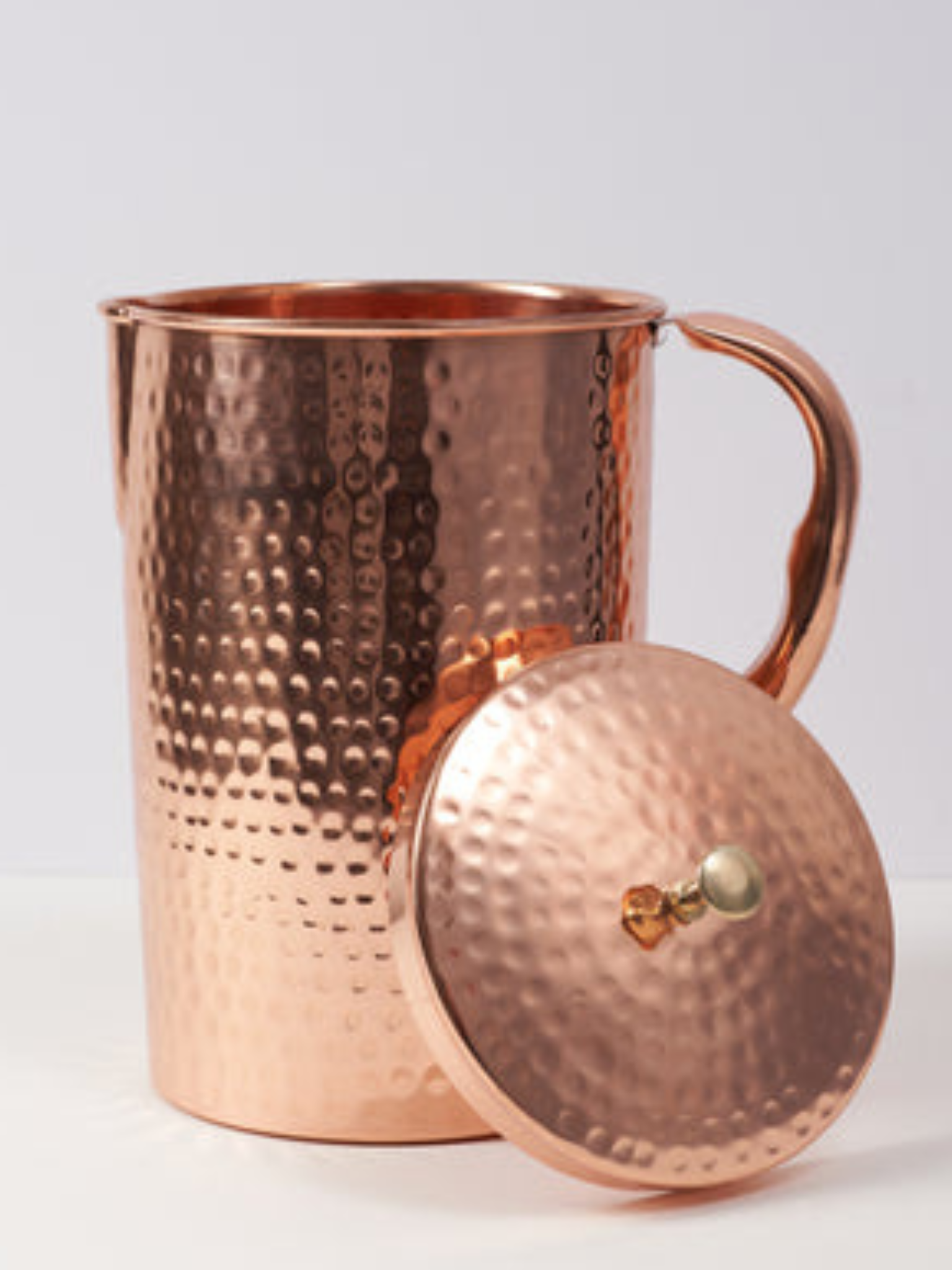 Yes! Our copper jug comes with a perfectly fitted lid to keep your water clean and dust-free while it charges overnight. The lid also makes it easy to store and prevents any spills. The lid is designed to sit securely while allowing for easy pouring - perfect for serving the whole family at breakfast.